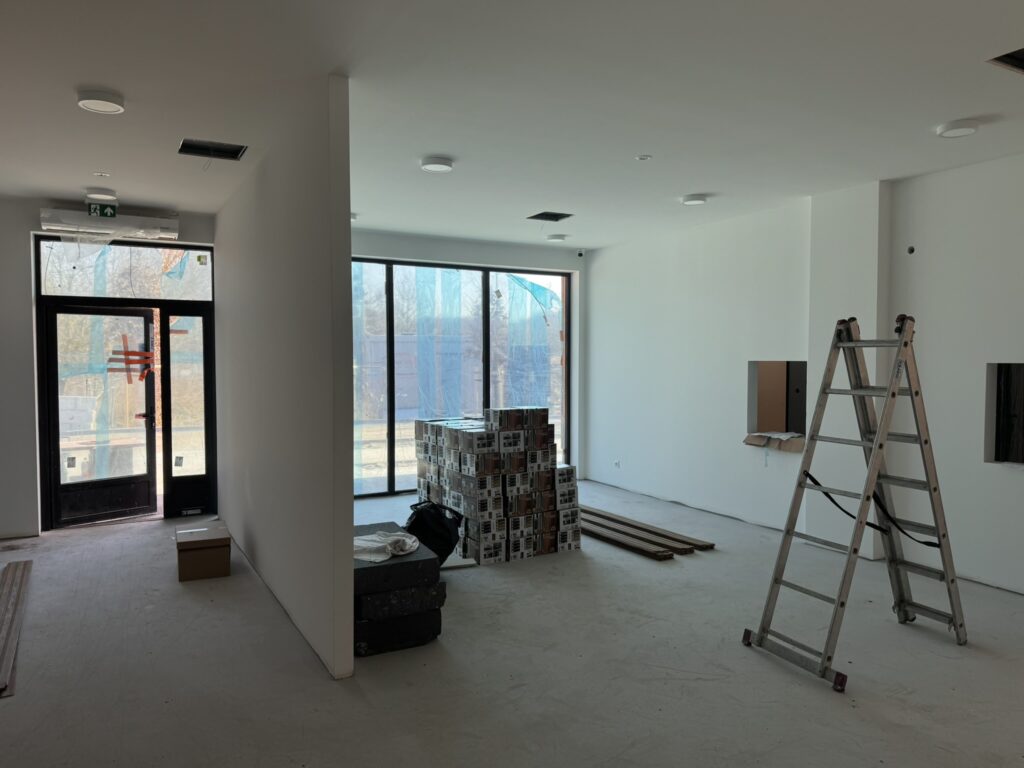 Wykonawca prowadzi prace wykończeniowe wewnątrz budynku.